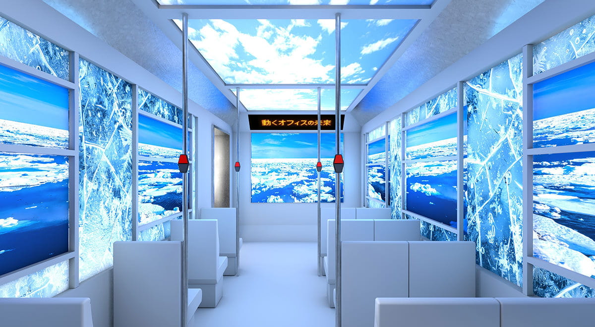 「うごく美術館」「うごくオフィス」「うごく旅館」の3つのシーンの未来を没入感のあるバス車内で体験することができます。この空間でしか味わえない未来の「運ぶ」に、乗車して体験することができます。 Prepare to be immersed in futuristic spaces upon entering the Bus to Tomorrow. Welcome aboard!