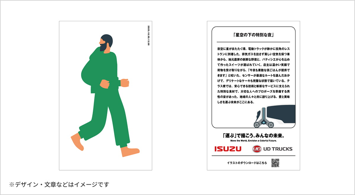 思い思いのポーズと自分らしさを組み合わせて、いすゞグループが描く未来の「運ぶ」を感じることができるあなただけの特別なステッカーを作成しよう!そのステッカーは、ブース内に貼ってみんなと共有することも、記念として持ち帰ることもできます。ぜひ、参加してください。 Strike your best pose in creating your own unique sticker that embodies the spirit of the booth and the possibilities of transport in the future! You can either post the sticker in the booth for everyone to see, or bring it home with you as a memento. Join in on the fun.