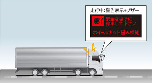 大型車の車輪脱落事故が年々増加している現状を受けて、国内の商用車として初めて、車輪脱落予兆検知システムを標準装備します。ホイールナットの緩みが発生した時の異常を検知※5し、車輪脱落の予兆の段階で警告表示とブザーでドライバーへ注意を促すことで、車輪脱落事故の予防に貢献します。