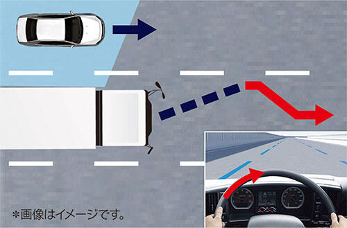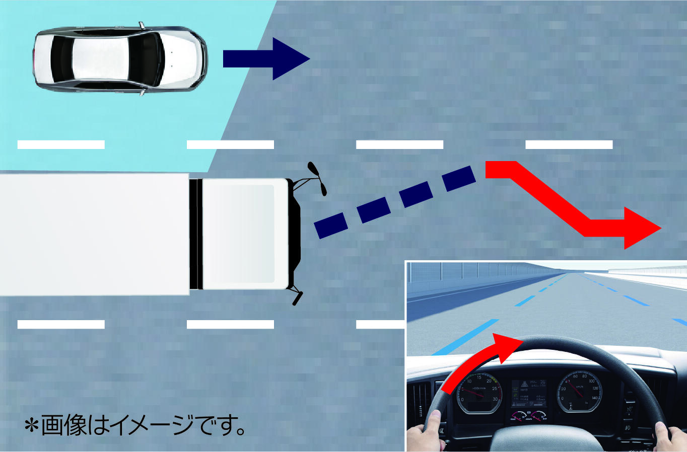 なお、本機能はLKA選択車に搭載され、完成車「Gカーゴ」では全車標準装備となります。- ※4作動条件…ウィンカー作動時および自車が白線に近づく場合、検知対象:バイク・自動車、検知対象速度:約25~120km/h以上、自車速度:約60~90km/h
