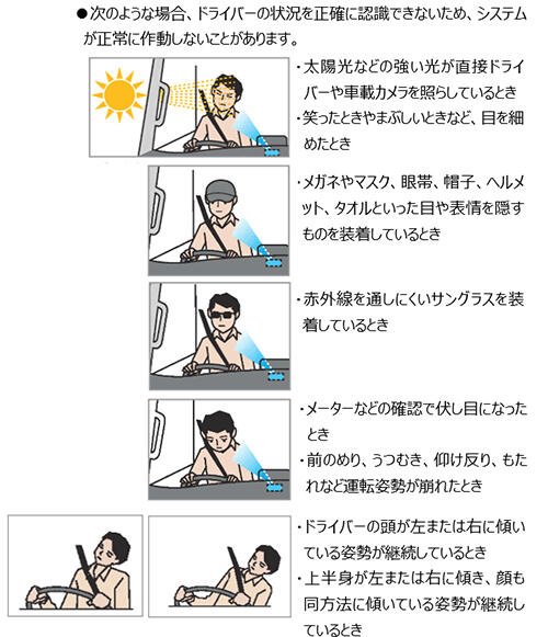 次のような場合は、ドライバーが継続走行可能な状態であっても、運転姿勢や表情によっては、システムがドライバーの異常と認識し、報知やブレーキを掛けることがあります。