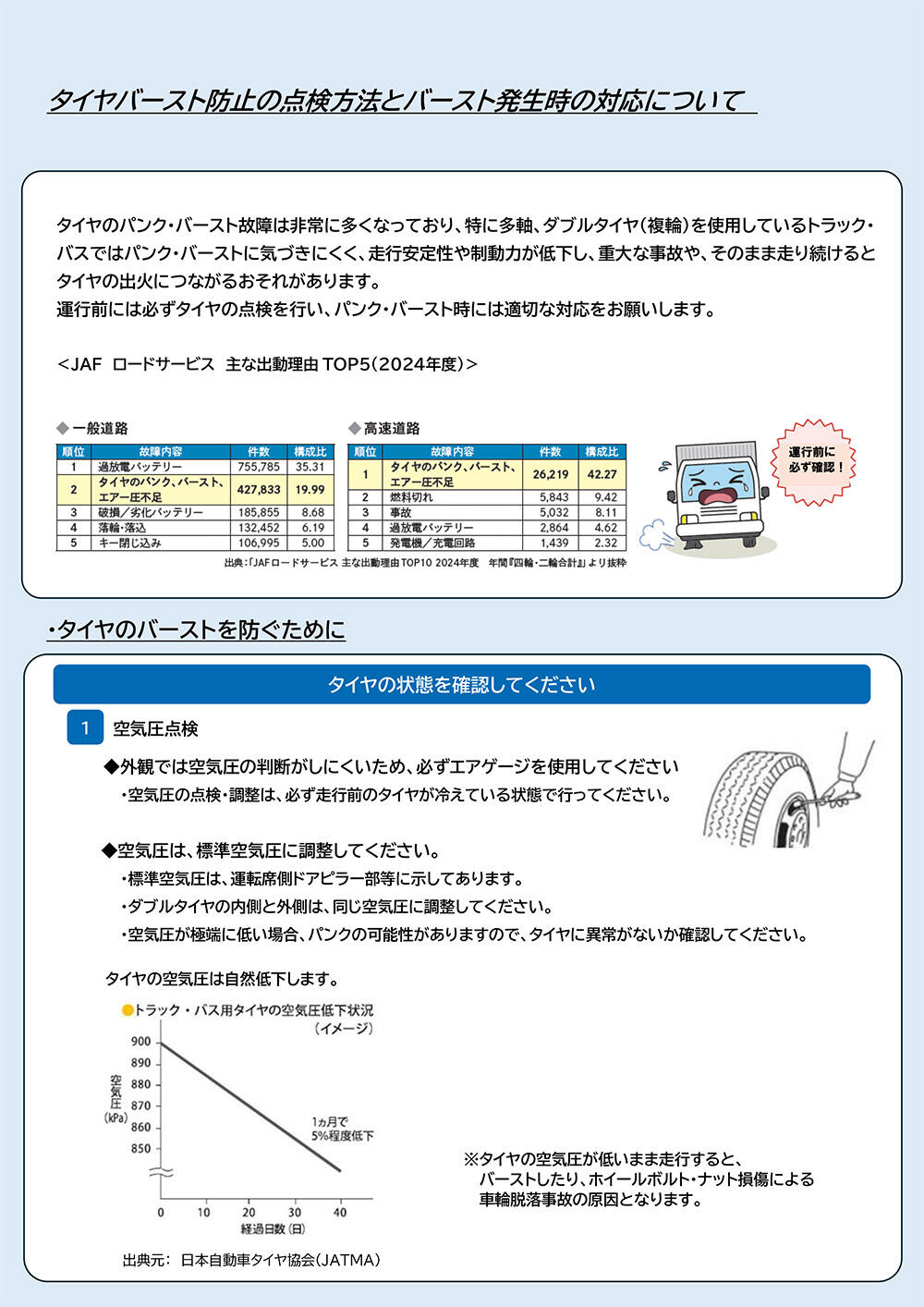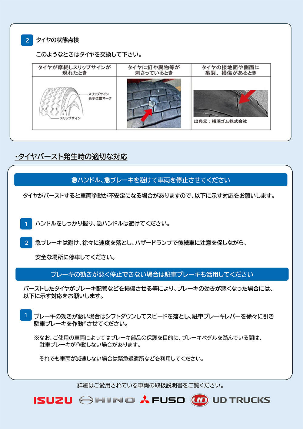 タイヤのパンク・バーストは、特にトラック・バスで発生すると、重大な事故や車両火災につながるおそれがあります。運行前のタイヤ日常点検と併せ、バースト発生時には、適切な対応をお願いします。大型車自動車メーカー4社(いすゞ自動車/日野自動車/三菱ふそうトラック・バス/UDトラックス)では、別紙で注意喚起を行っています。