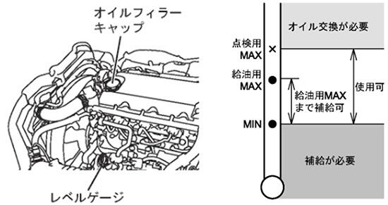 - ③オイルが不足していれば“給油用MAX”まで補給します。オイル量が“点検用MAX”を超えた場合は必ずオイル交換してください。