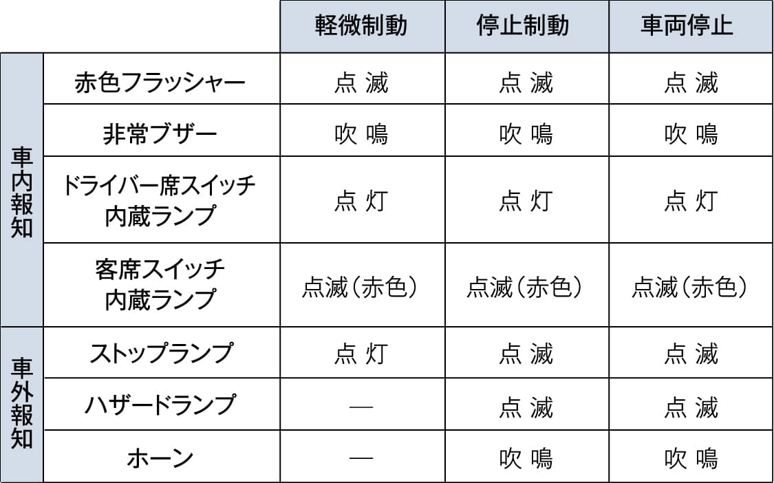 ドライバーに急病などの異常が発生した際、ドライバー自身又は乗務員がドライバー席スイッチを押すか、もしくは乗客が客席上部に設置された客席スイッチを押すことで車両が制動を開始します。同時に車内では、非常ブザーが鳴るとともに客席スイッチ内蔵ランプが点滅、赤色フラッシャーが点滅して乗客に伝達。一方、車外にはホーンを鳴らし、ストップランプとハザードランプを点滅させ異常を知らせます。