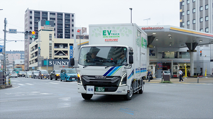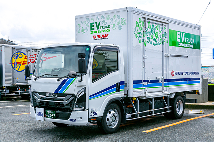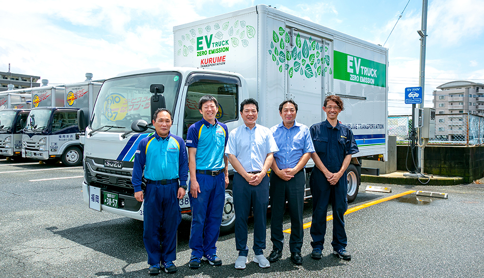 同社では2030年までに自社車両の1割をEV化する目標を立て、いすゞ自動車とタッグを組みながらカーボンニュートラル達成に向けて邁進しています。導入検討からアフターサービスに至るまでのリアルな事情について、久留米運送、いすゞ自動車の関係者に話を伺いました。