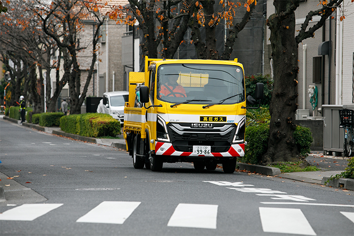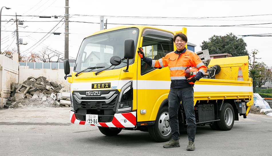 清水さん 当社のトラックは近年ほとんどいすゞ車だったため、いすゞ車を検討しましたが、EVは通常のトラックと仕様が異なるため他社製も比較しました。その中で決め手となったのは、「取り回しのよさ」。当社の工事車両は住宅地の狭い道路を走ることが多いため、サイズ感や小回り性能は重要です。