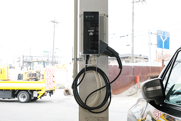 充電器は、駐車場に3kW仕様のものを設置し、乗用EVの充電と併用しています。長距離移動が多い場合には、より出力の大きい充電器が必要になるかもしれませんが、当社の走行距離であれば3kWの出力でも翌朝には満充電になり、運用にはまったく問題はありません。むしろ、これまで必要だった給油作業がなくなり、「運用が楽になった」という実感があります。