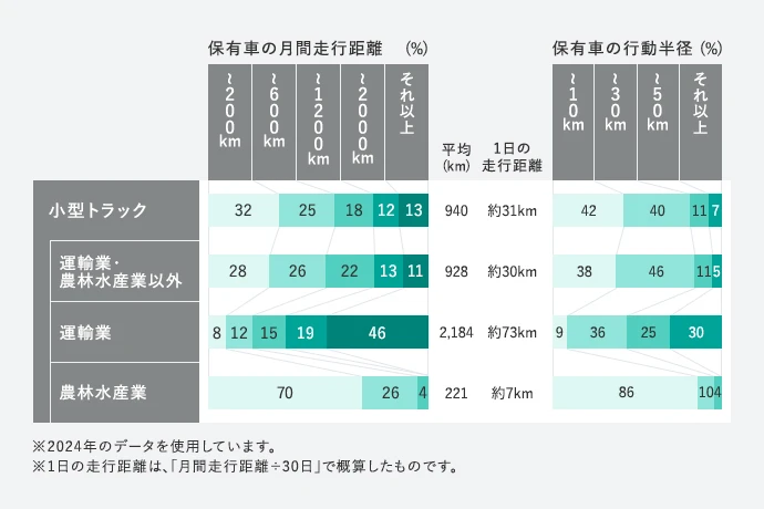 月間の走行距離と行動半径を見ると、1日あたりの走行距離は平均して100km未満が一般的と考えられ、特に非運輸業は短い傾向にあることがわかります。一充電あたりの走行距離が100km程度のEVトラックなら、大半の業務をカバーできる計算です。