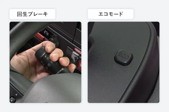 加えて、EVでは加速時にエコモードを使うと、出力が穏やかになり無駄な電力消費が抑えられます。また、下り坂などの減速時には回生ブレーキを活用し、減速エネルギーを回収しましょう。