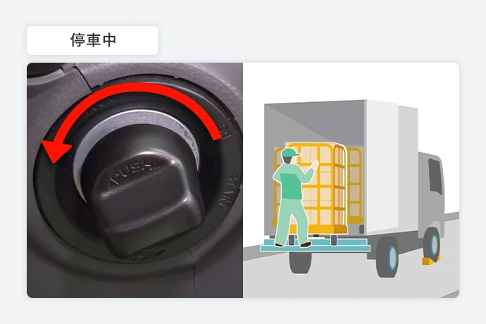 停車して荷物を運搬する場面では、スタータースイッチをロックしてEVシステムを停止しましょう。特に短時間の停車が多い現場は、EVシステムのこまめなオフが省エネにつながります。