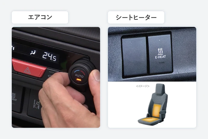 また、省エネの観点ではシートヒーターの活用も有効です。車内温度を上げるより、体を直接温めるほうが電力負担を抑えられる場合もあります。
