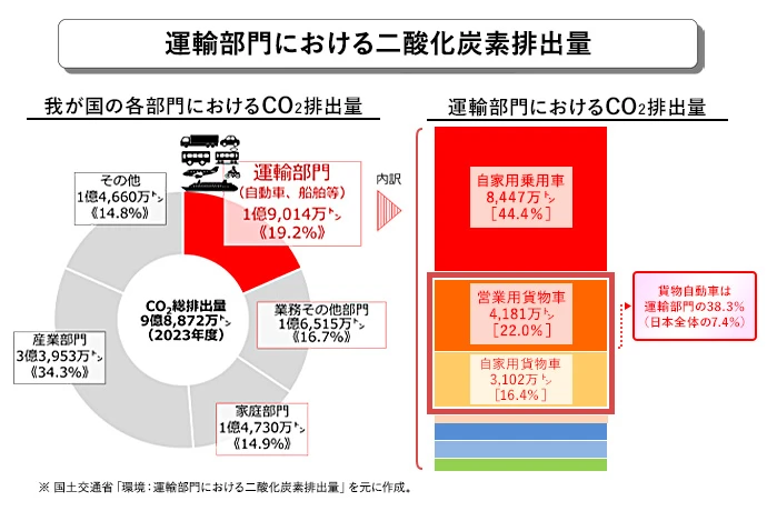 国土交通省によると、2023年度の日本の二酸化炭素排出量は約9億8,900万トンで、運輸部門はうち19.2%を占めています。また、貨物自動車は運輸部門の38.3%(日本全体の7.4%)を占めるため、すべてのトラックがEVに置き換えられると、日本全体の二酸化炭素排出量の約1割を削減できる計算です。