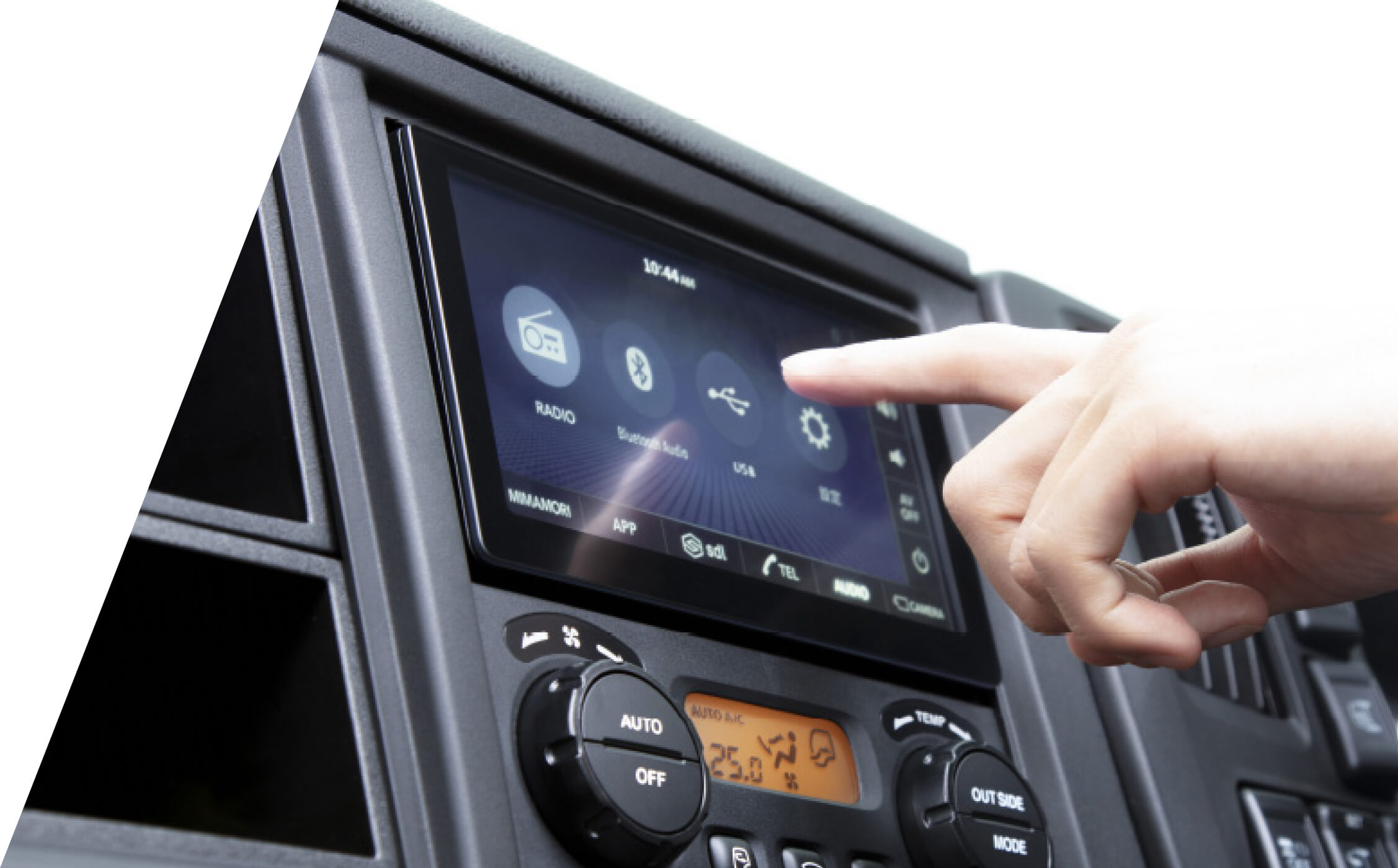 タッチパネル搭載の7インチのディスプレイです。バックカメラ映像の表示の他、AM/FMラジオ、音楽再生、MIMAMORI、ハンズフリー通話、SmartDeviceLinkTMなどの操作/表示ができます。*MIMAMORI運行管理機能をご利用の場合は別途ご契約が必要です。