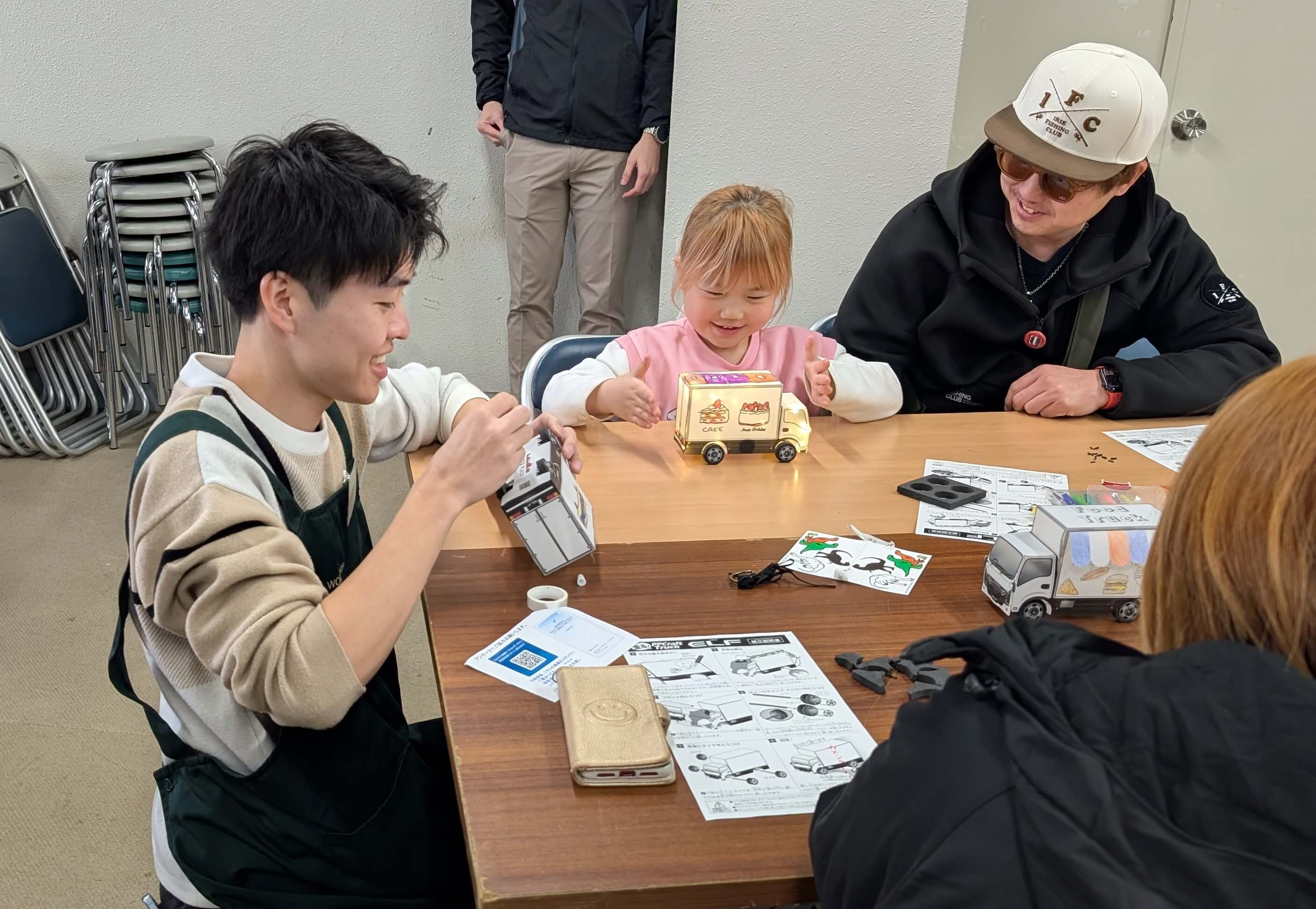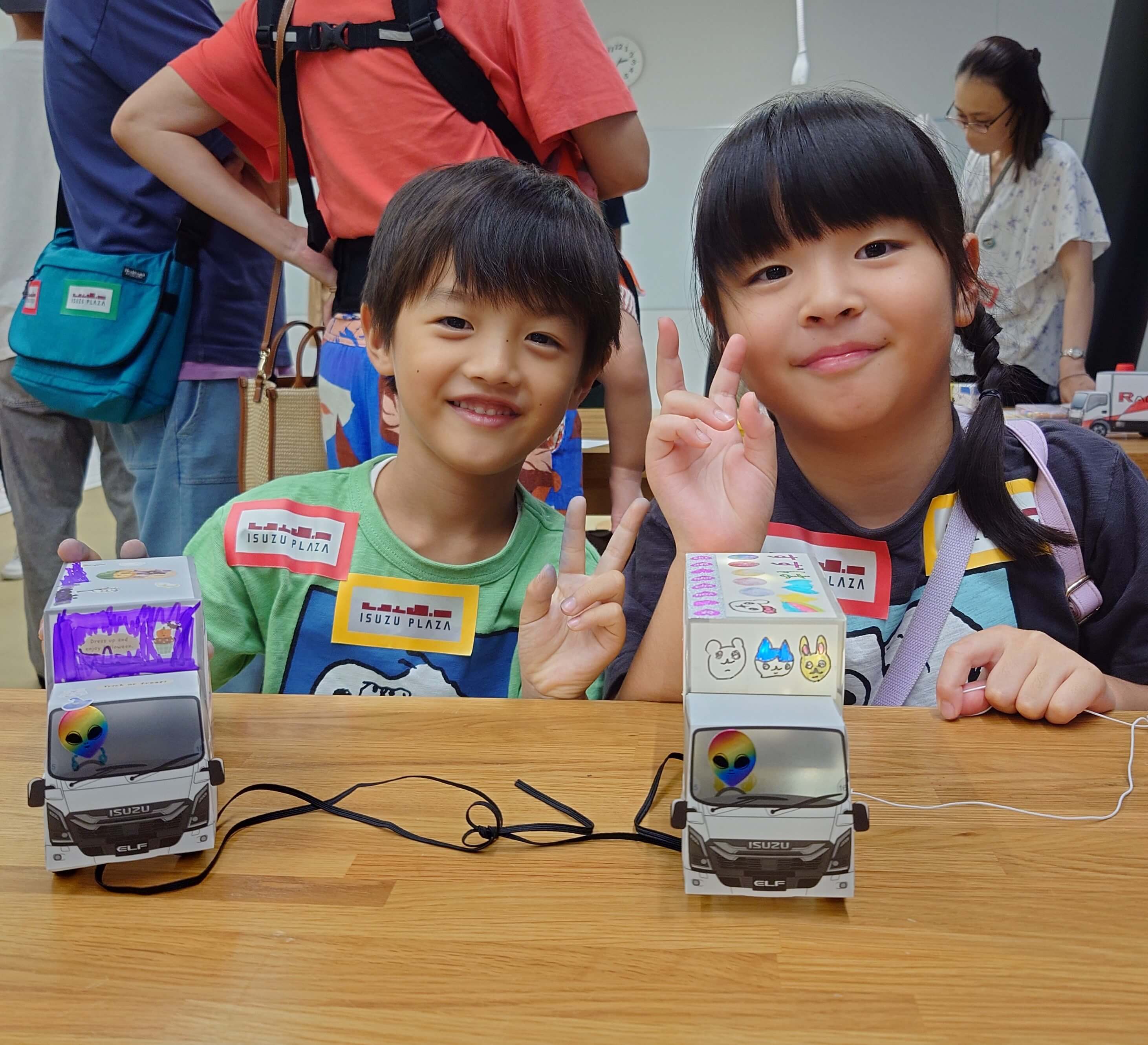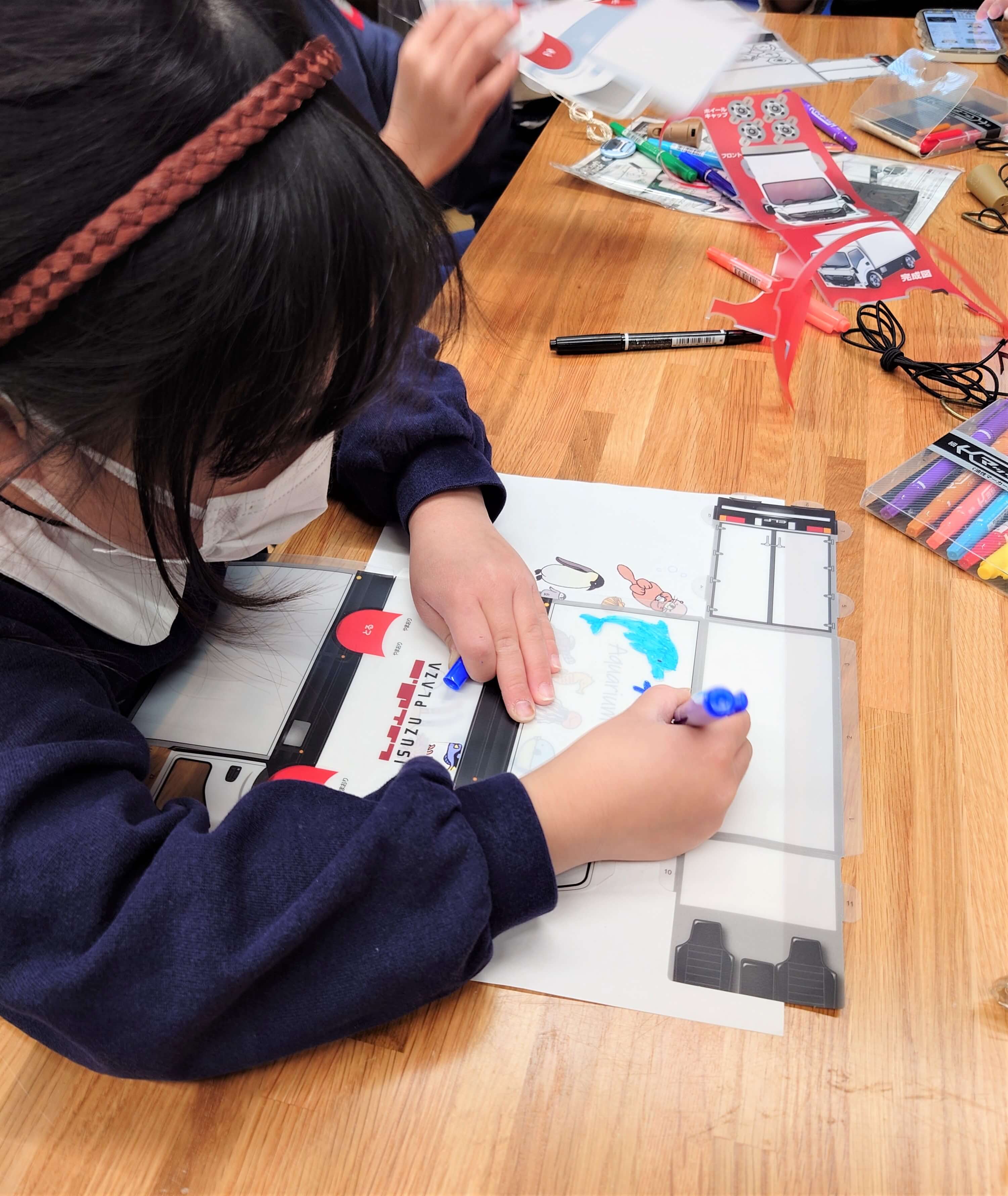 このデザイン教室きょうしつは、PPクラフト*のトラックに自由じゆうに絵えをかいたり色いろをぬったりして、世界せかいにひとつだけのオリジナルトラックをデザインするワークショップです。