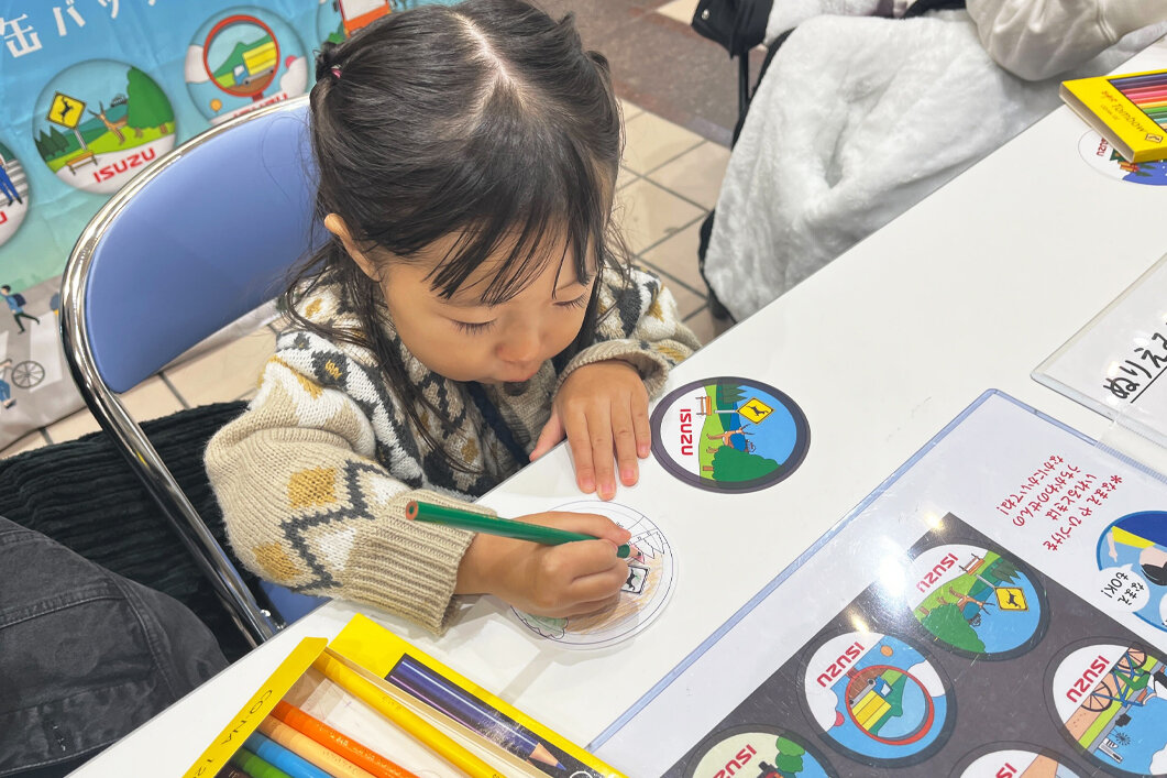 いすゞブースでは、夜間の視認性を高める反射材の効果を体験できるコーナーや、交通安全をテーマにした缶バッジ作りを実施。