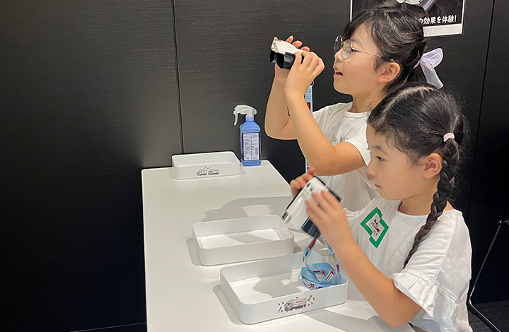 反射材 スコープ体験 暗 い夜道 でも車 から見 えやすい反射材 。ライトを当 ててスコープでのぞくと「わっ!こんなに光 るんだ!」と歓声 が。子 どもたちより大人 のほうが夢中 になる場面 もありました。