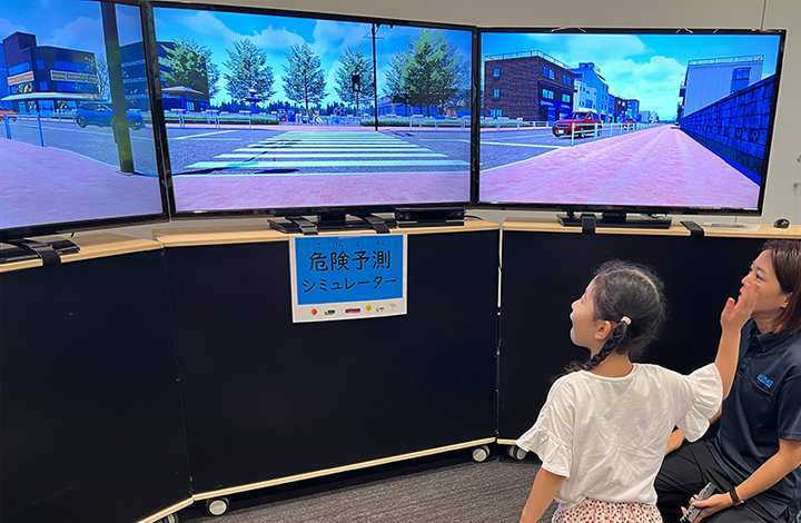 危険予測 シミュレーター信号 や車 の動 きに注意 しながら街 を歩 く映像 体験 。青信号 でも油断 は禁物 !「横断歩道 に入 るときは周 りをよく見 て」と親子 で学 ぶ真剣 な表情 がありました。